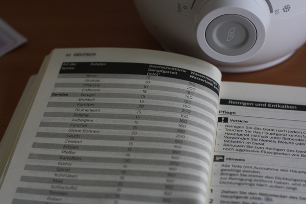 An der Aussage, dass der Avent Dampfgarer* 4 Portionen Babybrei gleichzeitig zubereiten kann, habe ich meine Zweifel, daher rechnen wir jetzt mal nach: Für 4 Portionen vegetarischen Mittagsbrei laut Grundrezept benötigt man 400 g Gemüse und 200 g Kartoffeln. Um 250 g Karotten zu dämpfen, benötigt der Dampfgarer laut der mitgelieferten Tabelle jedoch bereits 200 ml Wasser. Für unsere insgesamt 600 g Gemüse bräuchte man dann grob überschlagen etwa 480 ml Wasser. Das Problem ist: Der Wassertank des Baby-Dampfgarers kann nur mit maximal 320ml Wasser gefüllt werden. Aus meiner Sicht können daher nur etwa 2-3 Portionen Mittagsbrei gekocht werden. Für 4 Portionen reinen Gemüsebrei oder Obstmus reicht es allerdings wiederum aus, da dieser mengenmäßig weniger ist.